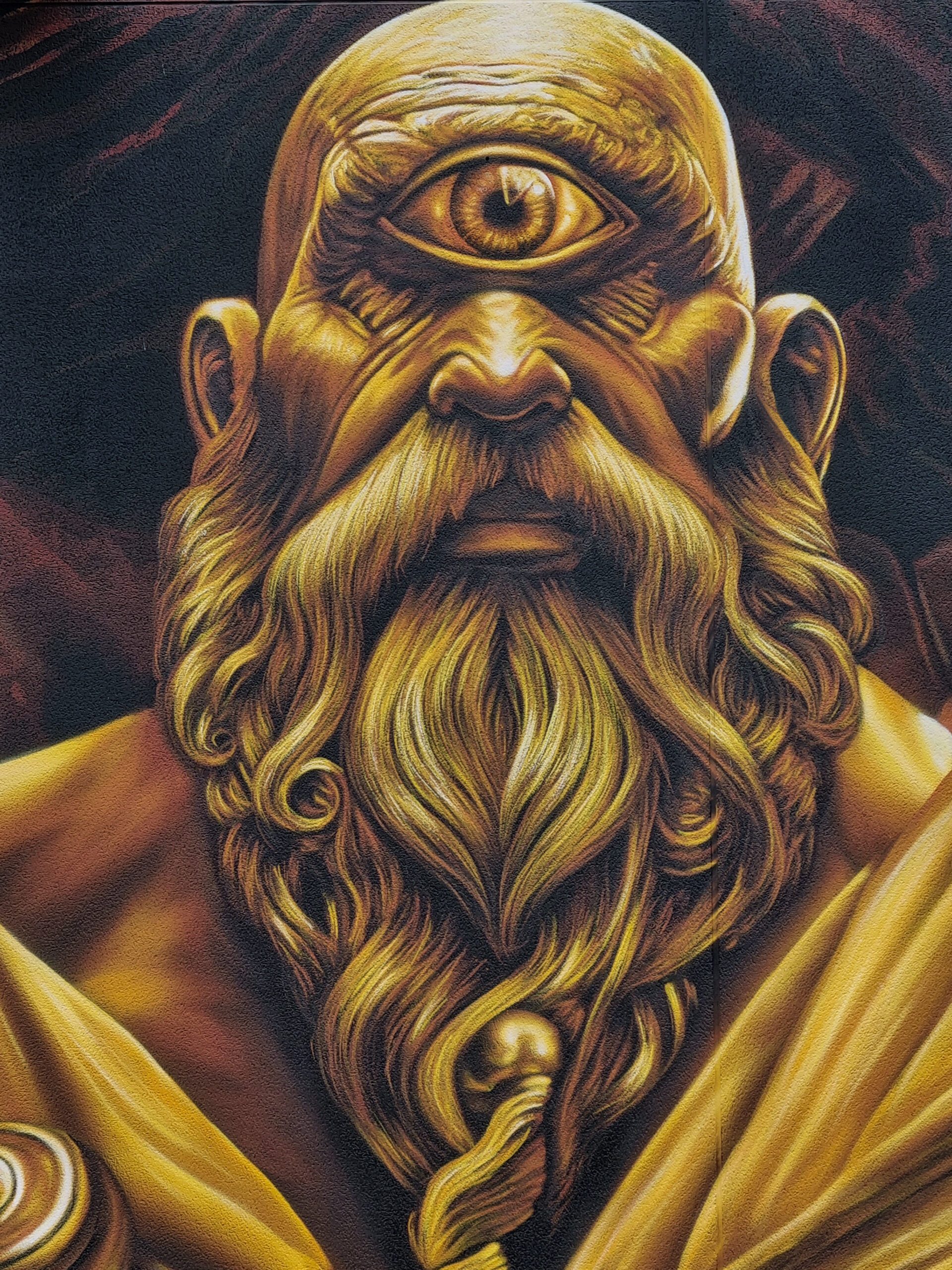 Tenía un único ojo gigante en la frente, generalmente cerrado y oculto por siete cubiertas. Al retirarlas, se producían efectos devastadores en la vegetación y el paisaje: